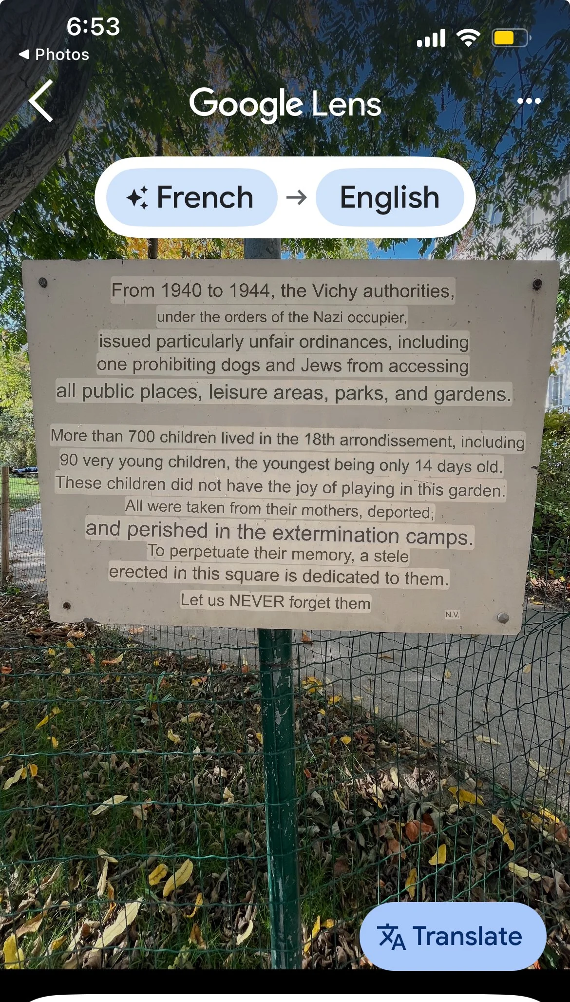 So, I left and went back down the hill. I didn’t want to go straight home, so I passed a park and entered. It was a lovely park. Kids were playing, adults were sitting on benches reading in the sun. There was a beautiful fountain and lots of mature trees and gardens. It was terraced. I came across the sign pictured to the right as I was leaving. I didn’t know what it said until I got home and put it through Google translate. Then it became crystal clear and made me sad again.